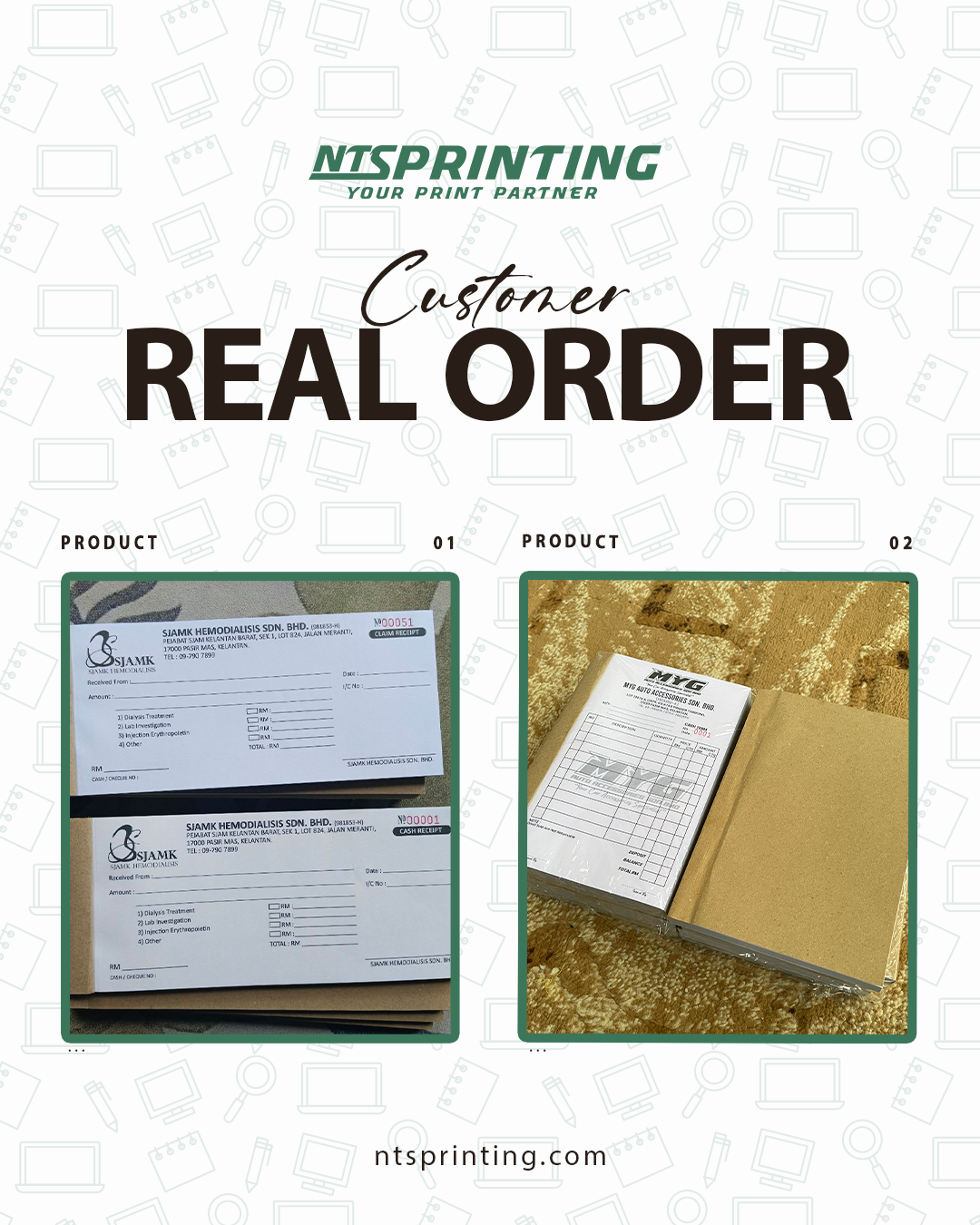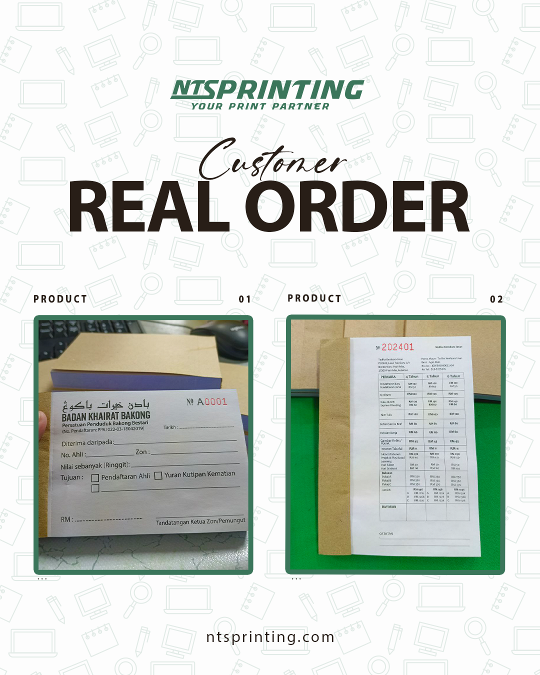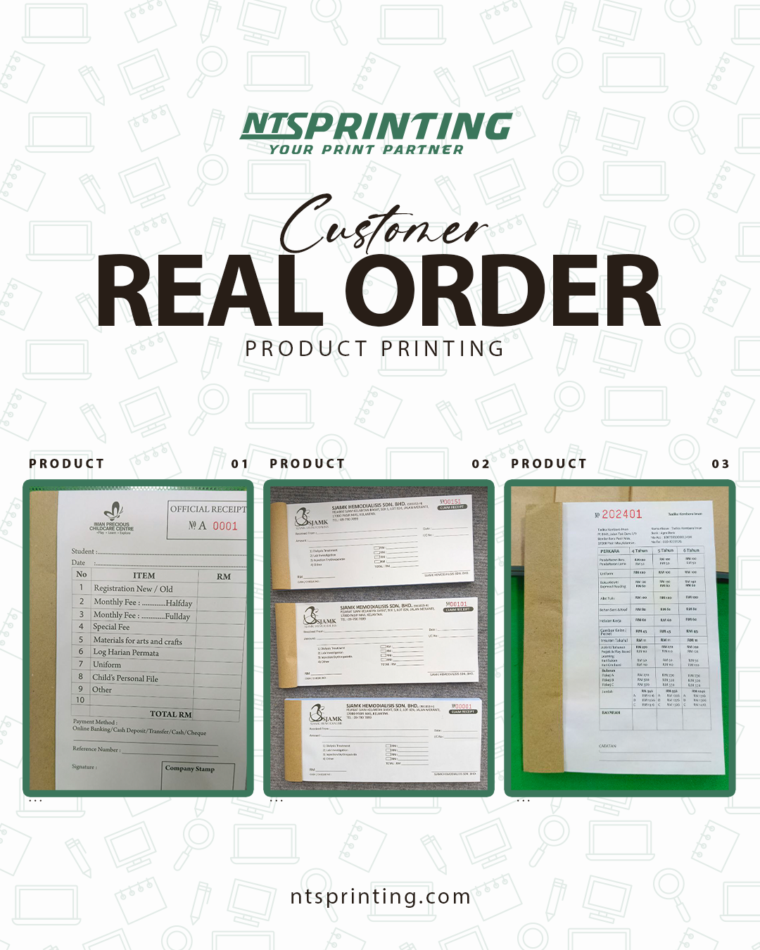 • Craft Paper (front cover - book only) • Craft Card (back cover) • Simili Paper 50gsm (Green / Blue /Yellow / Pink) • Bond Paper 50gsm (Green / Blue /Yellow / Pink) • NCR Paper 50gsm - Carbonize Paper (White / Green / Blue /Yellow / Pink) |